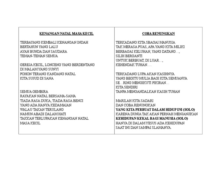 Kini semua berubah Kutelah terpisah jauh Namun kenangan natal di. Pada hari natal tlah tiba. Lonceng natal berdentang Memecah heningnya malam Teringat masa indah yang dulu Natal di dusunku Bersama sanak saudara Bersama papa dan mama Menyalakan lilin natal Di malam yang kudus Kini semua berubah Kutelah terpisah jauh Namun kenangan natal di dusun Akan abadi di hati Hanya lewat syair.